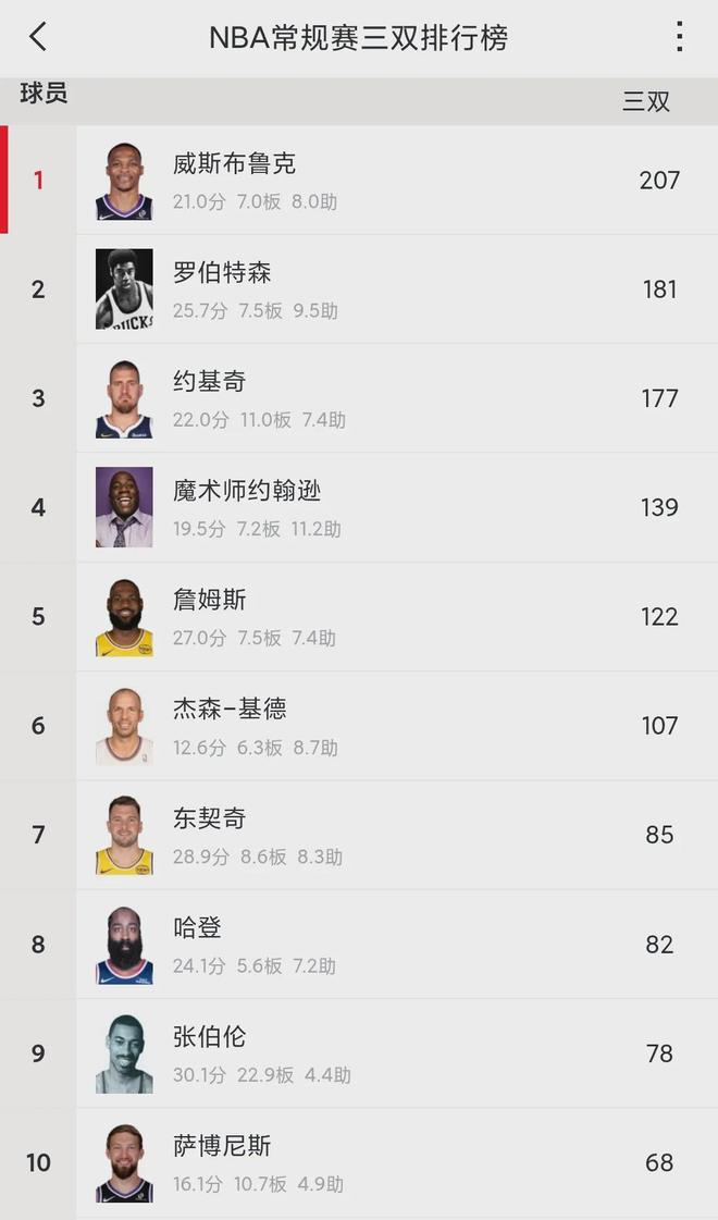 小萨生涯至今拿了68次三双,排名NBA历史第10。同时也是现役第6,仅次于威少(207)、约基奇(177)、詹姆斯(122)、东契奇(85)和哈登(82)。不过,本赛季小萨一次三双都没拿过,如今他的竞技状态堪忧。
