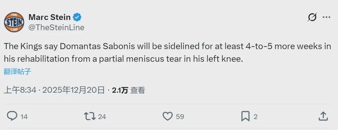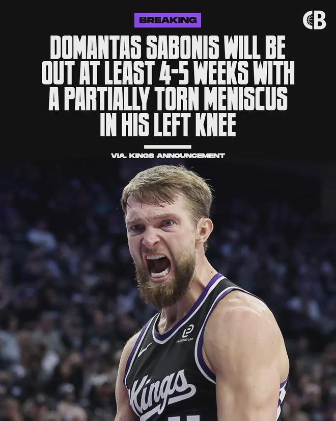 北京时间12月20日上午,据NBA名记Marc Stein报道,国王官方透露,球队内线小萨博尼斯因左膝半月板部分撕裂,至少再缺阵4-5周。此前小萨已经休战了一个月,接下来还得继续休战一个多月。目前国王6胜21负,西部倒数第三。